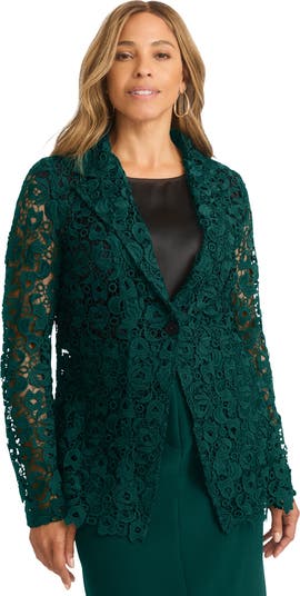 The new statement jacket featuring all-over embroidered lace, a classic notch collar and a femme scalloped hem. Single-button closure.