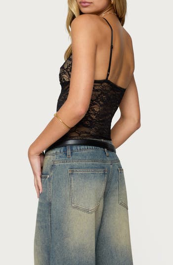 Semisheer stretch lace romances this figure-sculpting bodysuit made with slinky adjustable straps for a supportive fit.