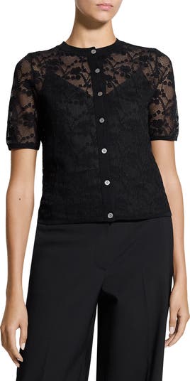 Rich intricate lace adds romance and a semisheer effect to this close-fitting cardigan updated with abbreviated sleeves.