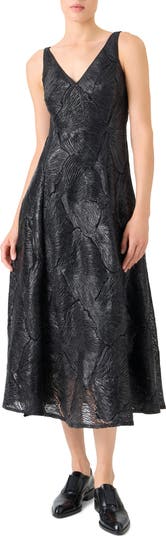 Silvery cording in feathery patterning brings subtle shimmer to this stunning lace cocktail dress cut in a fit-and-flare silhouette.