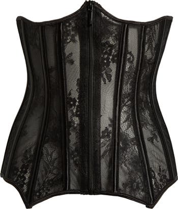 Lacy panels lend intrigue to this classic corset with a front zipper for extra convenience.
