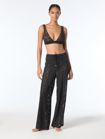 These lightweight and cool cover up pants make going from beach to street a breeze. An allover lace adds sultry sophistication to your sun style. Coordinate with matching lace swim styles or add this statement to a solid option.