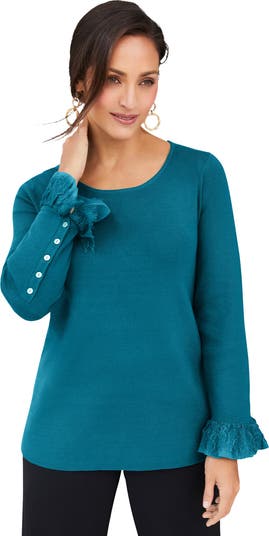 This classic pullover gets a feminine makeover with lace bell cuffs and Georgette underlay, plus goldtone buttons on the bell sleeves. The scoop neckline and relaxed silhouette make this a comfy-meets-chic choice for on-the-go style.