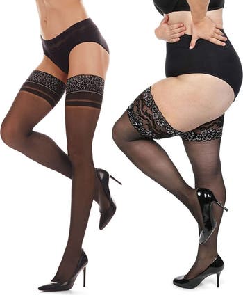 Lacy jacquard cuffs top these sheer tights featuring a double-banded design and a flirty back seam.