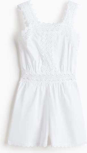 Playsuit in a cotton weave detailed with lace insets. Features a square neckline, lace trim around the top and wide lace shoulder straps. Concealed zip at one side, gathers at the waist, discreet side pockets and short legs with lace-trimmed hems. Unlined.