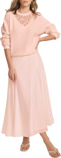 Sweatshirt featuring a crew neckline, long lace panel sleeves and lace yolk insert.