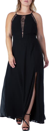 Lacy insets romance this night-out maxi featuring cutaway shoulders and a stem-showing side slit.