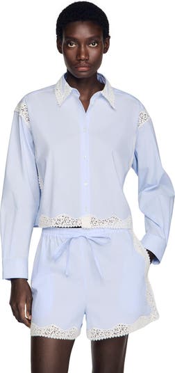 Straight-cut cropped shirt with lace details, shirt collar, long sleeves with buttoned cuffs and button fastening.