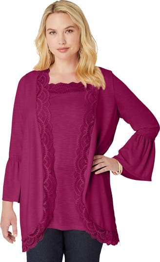 Double up on intricate and rich lace detail with this set. Lace trim lines both the open front and rounded hem of the cardigan and the square neck of the tank, offering alluring charm to your look. Bracelet-length bell sleeves on the outside layer add a final flourish. Banded straps and relaxed silhouette on the tank. It's incredibly versatile—wear the set together, style the tank alone or layer the cardigan over a sleeveless dress.