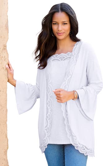 Double up on intricate and rich lace detail with this set. Lace trim lines both the open front and rounded hem of the cardigan and the square neck of the tank, offering alluring charm to your look. Bracelet-length bell sleeves on the outside layer add a final flourish. Banded straps and relaxed silhouette on the tank. It's incredibly versatile—wear the set together, style the tank alone or layer the cardigan over a sleeveless dress.