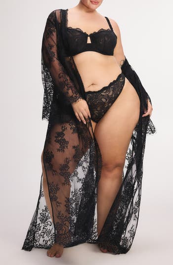 A floor-length silhouette and scalloped floral lace dial up the romance in this bell-sleeve robe framed by dramatic side slits.