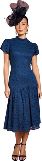 Embrace timeless elegance with this stunning lace midi dress from Coast. Perfect for weddings, races, or any formal occasion, this dress combines classic charm with contemporary flair. The high neck and frill sleeves create a graceful silhouette, while the intricate lace pattern adds depth and texture. The fitted bodice accentuates your figure before flowing into a flared hem, creating a beautiful, feminine shape.