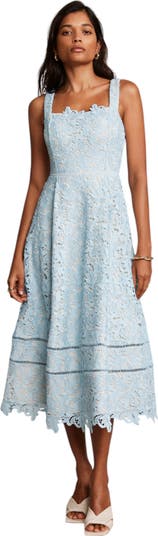 Pale blue tone lace dress in a midi silhouette featuring a square neckline, shoulder straps, nipped waist, full skirt, open stitch detailing with a zip fastening through the back.