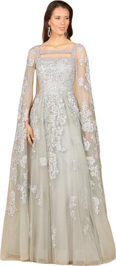 Elegant A-line gown with a high neckline and long flowing floor length cape sleeves. This gown features an embellished bodice and modest coverage with cascading embroidery, perfect for your next big event. Flowy dress for that perfect ethereal feel look!