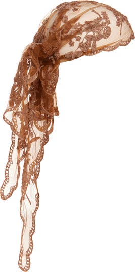 Put a beautifully boho finishing touch on your look with this sheer lace hair scarf sweetened with scalloped edges and intricate floral embroidery.