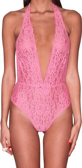 A plunging halter neck lends racy flair to this stretchy teddy with drapey silk-blend ties.