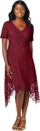 A fashion-forward A-line silhouette with allover lace design. Feminine V-neckline; flirty handkerchief hem. Back zipper. Nylon knit lining to the knee.