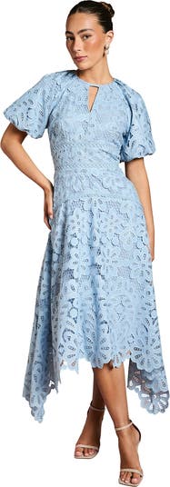 Make a lasting impression at your next special event with this stunning lace dress from Coast. The intricate floral lace pattern adds a touch of sophistication, while the dramatic puff sleeves create a romantic and feminine silhouette. The round neckline features a subtle keyhole detail, adding interest to the décolletage area. The asymmetrical hanky hem provides graceful movement as you walk, ensuring all eyes are on you.
