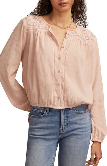 A gathered hem gives a bubbly silhouette to this cotton shirt featuring a sheer, lacy inset across the top.