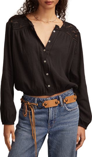 A gathered hem gives a bubbly silhouette to this cotton shirt featuring a sheer, lacy inset across the top.