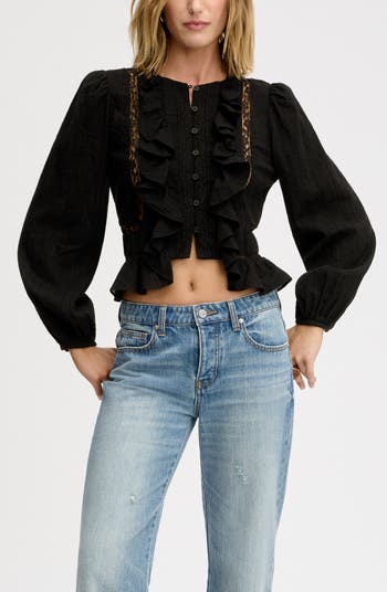 Pure prairie charm animates a lace-lilted shirt cut from cool cotton and rippled in ruffles.