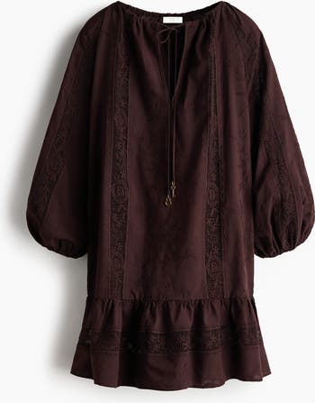 Short, oversized tunic dress in a cotton weave detailed with embroidered motifs and lace insets. Round drawstring neckline with a V-shaped opening at the front, long raglan sleeves with narrow elastication at the cuffs and a gathered seam at the hips creating a gently flared hem. Unlined.