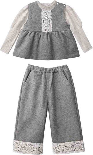 A sweetly coordinated ensemble that blends soft textures with delicate lace—perfect for cooler days and elevated playdates. Grey sleeveless tunic with gathered waist and white lace panel, layered over a ribbed cream long-sleeve. Wide-leg grey pants with elastic waist and matching lace-trimmed hem.