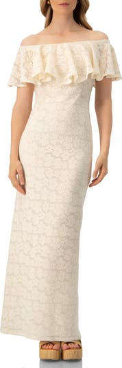 Sleeveless long dress in knitted lace with a Bardot neckline and ruffle detail.