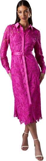 Exquisite all-over lace design for a luxurious look. Collared neckline adds a sophisticated touch. Long sleeves provide elegant coverage. Midi length offers versatile styling options. Matching belt accentuates the waistline. Make a striking entrance at your next special occasion with this stunning lace shirt dress from coast. The intricate lace pattern adorns the entire garment, creating a captivating texture that's sure to turn heads.