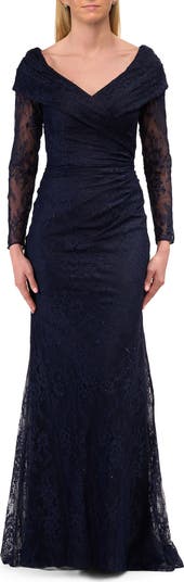 A refined lace evening gown designed with an elegant V-neckline and sheer long sleeves. The fitted bodice features delicate crossover detailing, flowing into a soft, floor-length skirt. Back zipper closure.