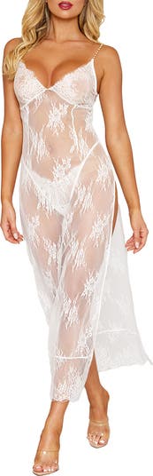 Chain straps, satin and a daring slit bring bold detail to this longline chemise and matching G-string made from sheer floral lace.