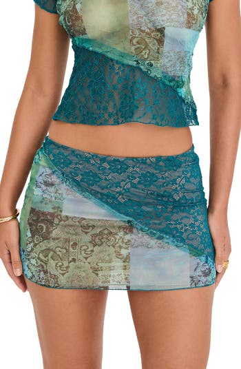 Panels of lace and mesh create a '90s-inspired patchwork look on this flirty miniskirt cut in a curve-highlighting fit.
