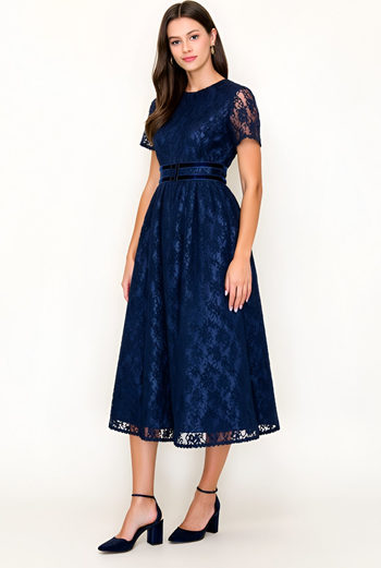 Lace Midi Dress with Sheer Short Sleeves and Velvet Waistband Detail