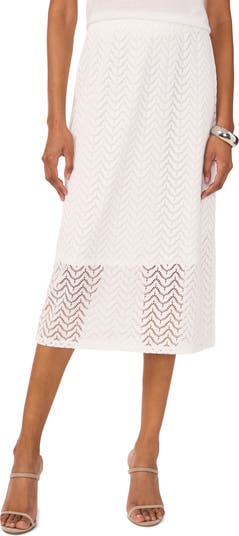 Sweet nostalgia styles this midi skirt rendered in a creamy hue with an eye-catching lace design.