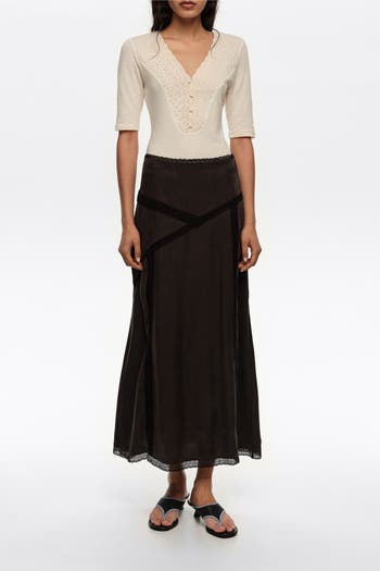Midi A-line skirt in a lyocell blend. Features all-over lace detailing.