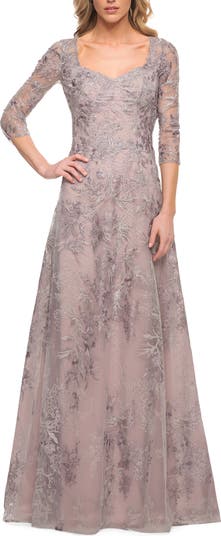 Lace gown with full skirt and illusion three-quarter sleeves. Unique neckline with V middle. Back zipper closure.