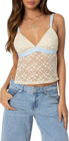 An open back adds to the sultriness of this sheer lace tank in a cropped length.