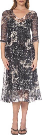 From suitcase to sensational entrance, this wrinkle-resistant combo of lace, charmeuse and chiffon is cut into a cocktail dress that will never show its mileage.