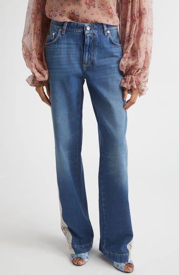 Rugged denim is refined by delicate lace panels layered over the outseams of these straight-leg jeans, bringing the label's flair for drama and romance to the classically casual style.