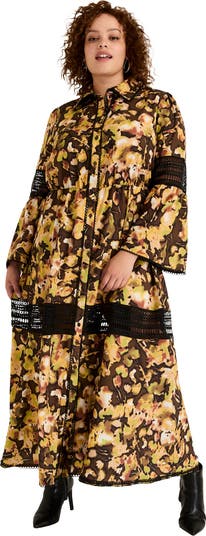Embrace timeless elegance with our printed dress featuring lace paneling. The classic collar and button-down closure offer sophistication, while the elasticated and self-tie waistband ensures a perfect fit. The sharkbite hem adds a stylish touch for any occasion.