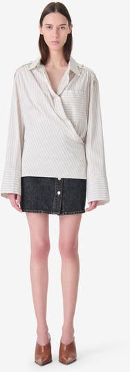 The Lace Poplin Wrap Shirt reimagines a menswear staple with a feminine twist, featuring a flattering crossover front and sharp pinstripes that create a modern, architectural silhouette.