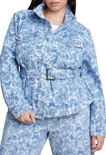 Make a subtle statement in this lace-printed denim jacket finished with a removable belt for definition. Flap pockets and a structured collar balance utility with everyday versatility.