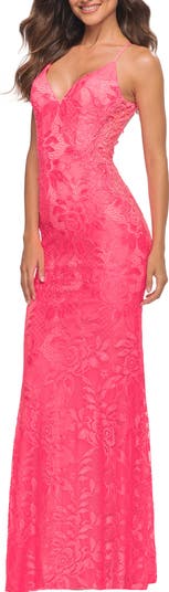 La Femme Lace Prom Dress with Illusion Embellished Sides in Neon Colors, Main, color, Neon Pink