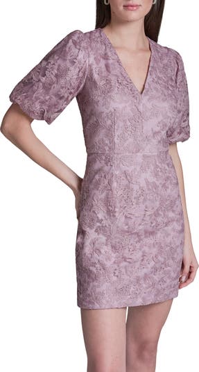 Romantic, flowery lace sweetens this stem-showing dress designed with voluminous puff sleeves and a sharp V-neckline.