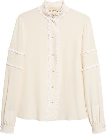 Ruffled white lace trim edges the placket, collar and cuffs of this vanilla-hued silk crêpe de chine shirt that's further enhanced with lace-framed pintucks centering the sleeve. Crystal-centered domed buttons lead to a dazzling pavé one at the high neckline for a sparkling finish.