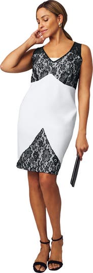 - Elevate your wardrobe with this sophisticated lace dress. The sheath silhouette with shaping seams is crafted to flatter your figure for all-day comfort and ease. Sheath silhouetteV-necklineSleevelessLace on front panel from shoulder and around bust to bottom hem Princess seams on back for shapingBack zip with hook and eye clasp Bust dartsFully line