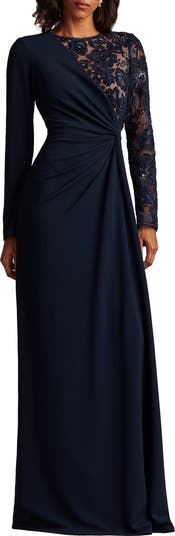 Lovely lace and lustrous sequins romance this glamorous gown made with a gathered-and-twisted waistline and a lightly flared skirt.