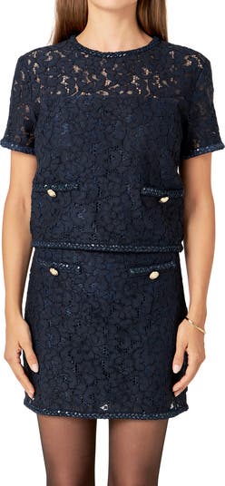 Date night is imminent in this semi-sheer top crafted from delicate floral lace and trimmed with lustrous tonal sequins.