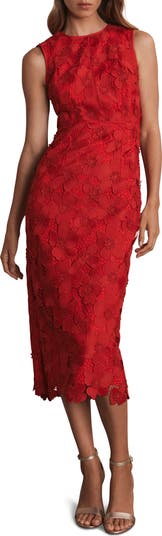 Red floral lace dress in a midi silhouette featuring a crew neckline, piped detailing with a zip and button fastening through the back.