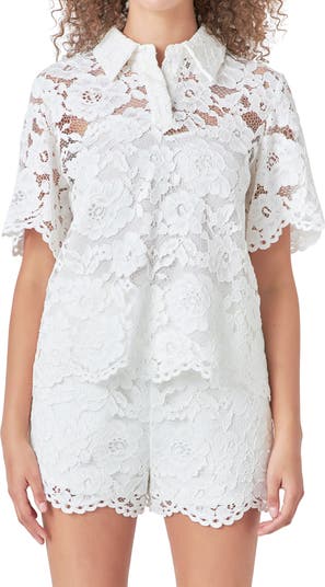 Polish meets charm in this lacy shirt designed with semisheer accents and abbreviated sleeves.